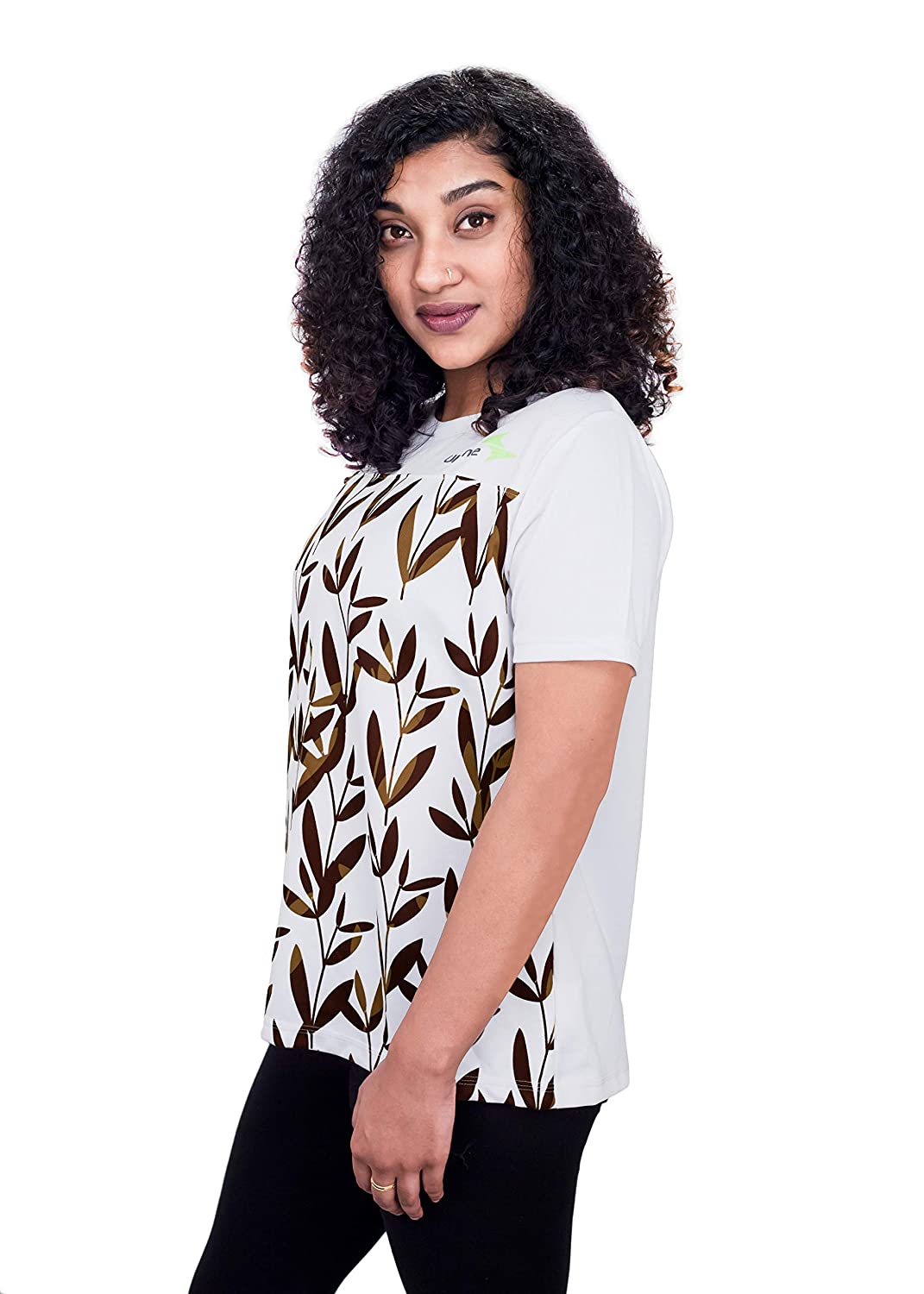 Uhane Women’s Gym Dri-Fit Work-Out Round Neck Loose Fit T-Shirt (White with Brown Leaf Print) Short Sleeves Printed Top for Sports and Fitness